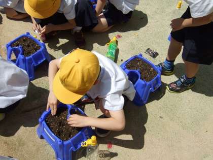 教室で種の観察をしたあと、いよいよ運動場に。まず、用意していただいていた土を鉢に入れました。みんな手際がいいです。