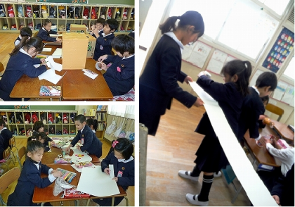 生活科「おもちゃランド」の準備を1・2年生一緒に進めています。ミニミニボーリング・どうぶつオリンピック大会・さかなつり・くう気ほう・ふくわらい・かみぽっくりの6つのコーナーに分かれて活動します。おもちゃやコーナーの看板をつくったり,ルール説明の文章を考えたりしています。