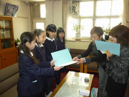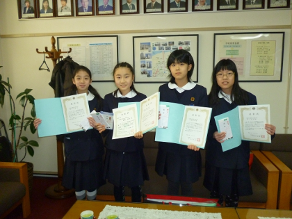 大阪梅田ライオンズクラブの方々が来校され,校長室で代表の子どもたちに表彰状と記念品を授与していただきました。