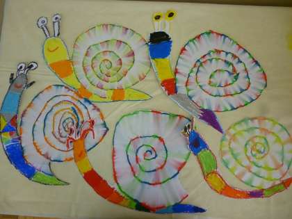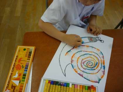 音楽科の学習でかたつむりの歌を歌っているので、目玉はもちろんつのを描いている子もいます。色や模様も思い思いの表現が光ります。