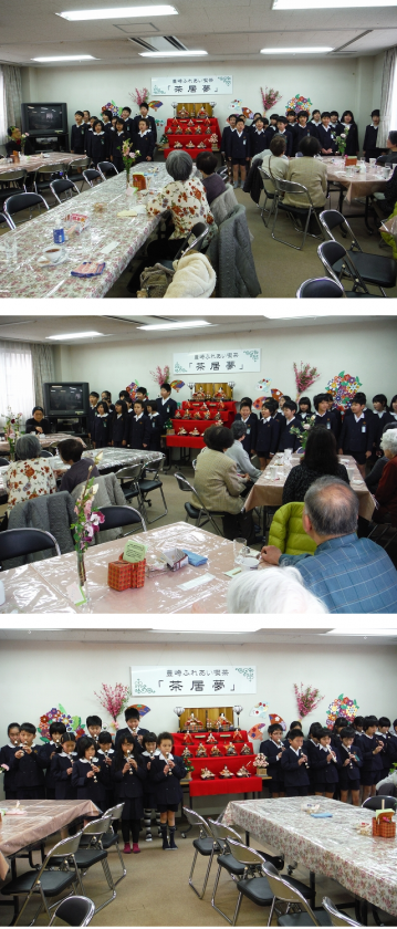 4年生が,豊崎会館で毎月第1月曜日に開催されている『ふれあい喫茶』に参加しました。 今日は,桃の節句。豊崎会館に雛人形が飾ってありました。