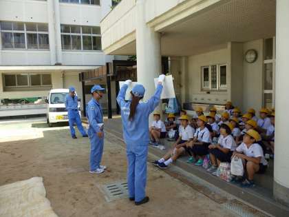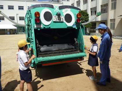 今週月曜日の西淀工場の見学に続き、今日は環境事業局の方に学校に来て頂きパッカー車体験を行いました。説明をうかがったあと、実際に目の前でパッカー車にタンスを投入するところを見て驚きの表情の子どもたち。「一瞬で粉々になった!」「すごい音!」というものから「まだまだ使えるタンスなのにな」「もったいないな」というものまで、いろいろなことを感じたようです。その後は家から持ってきたゴミをボタン操作をさせてもらいながらパッカー車に投入したり、運転席に乗せて頂いたりと楽しみながら学ぶ、良い授業となりました。ちなみに大阪市のパッカー車がごみ収集の時に流している音楽は何曲あるかご存知ですか?本校の4年生以上の子どもたちは知っていると思いますので是非聞いてみてくださいね。