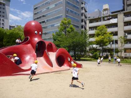 豊崎西公園(子どもたちにはたこ公園で通っています。)は遊んでいる子も多いなじみのある公園なのに見えてくると「どきどきする!」といった子もいるほどです。うれしくてたまらないようです。