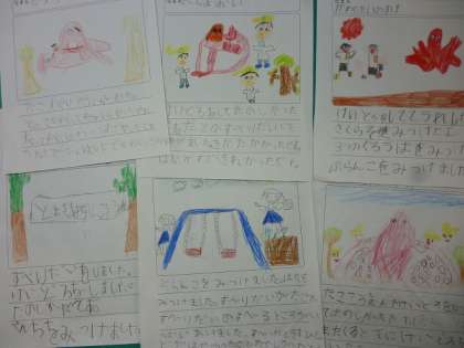 学校に帰ってから、今日見つけたことやしたことを絵や文章にまとめました。ひらがなを習ったばかりの1年生ですががんばって表現できました。