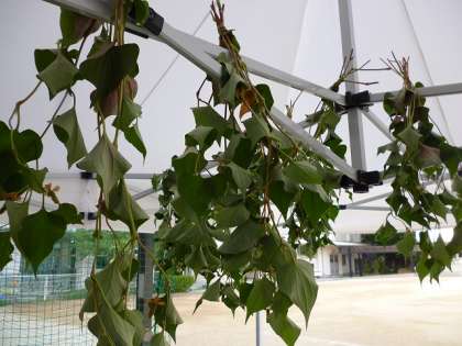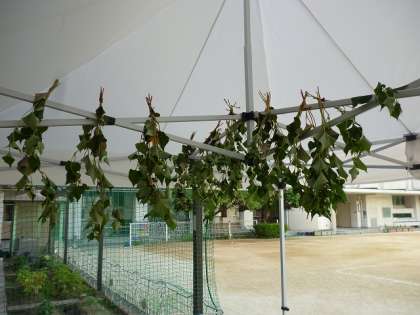 「校内の植物を使って、何か楽しいことはできないか」を話し合いました。いろいろな意見が出ましたが、まずは「どくだみ茶とカキの葉茶を作ろう!豊崎小学校のみんなにもふるまおう!」ということになりました。今日は、放課後に、植物実行委員が中心になって「どくだみ」の収穫をしました。体によさそうな独特の香りがただよう中、根っこから刈り取って、輪ゴムで束にして、校庭のテント下に並べて干しました。「どくだみ茶ができたら、給食の時間に、各学年の教室に配って飲んでもらおうか」「夏の暑い時期に職員室前に置いて、『ご自由にお飲みください』にしたら?」夢は大きくふくらみます。