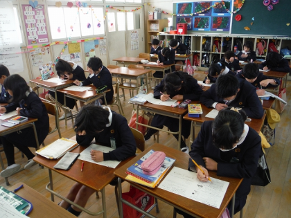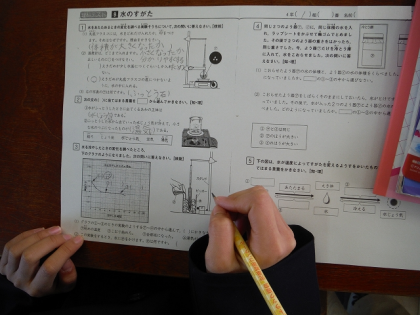 ノートにまとめた後,「水のすがた」のまとめのプリントをテストのつもりで取り組みました。授業時間内に解説をしました。来週にテストをします!