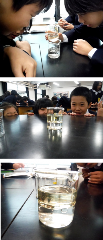 結果は,ほとんどの班の予想通り二層にわかれましたが,なぜそうなるのかの理由を整理して発表する班の子がいました。