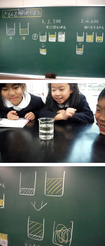 今日は,各班から一人ずつ黒板に予想図をかいてもらいました。その後,予想を立てた理由をどの班もしっかり述べることができました。水に少量の油をたらした様子,油に少量の水をたらした様子から想像している班,水と油の(同体積の)重さに着目する班とほぼ二手にわかれています。