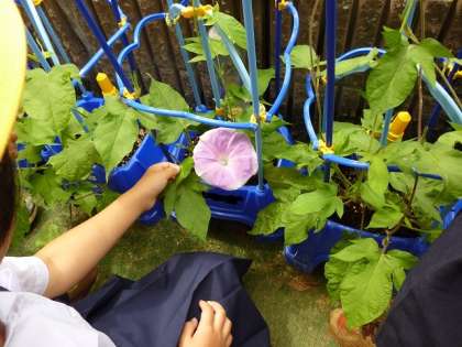 「せんせい、わたしのあさがお、さいてる。」