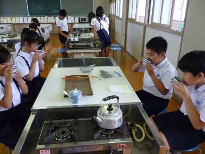 今日はその試飲会です。家庭科で学習したとおりに、湯を沸かし、お茶パックに入れたどくだみ茶を急須に入れて、お湯を注いで、回し注ぎをして、「いただきます!」………