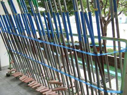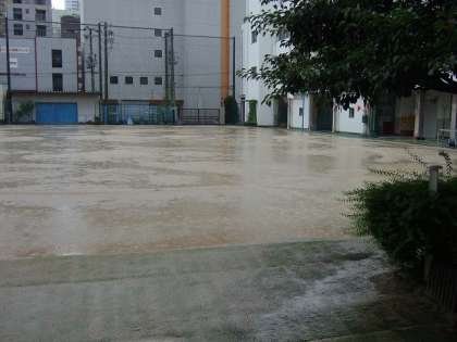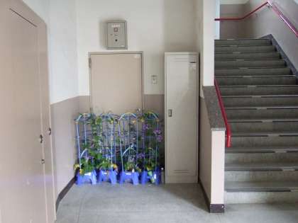 学校では,台風に備えて1・2年生がアサガオやミニトマトの鉢を移動させたり,先生方でテントをたたんだり,竹馬をまとめて紐でくくったりしました。