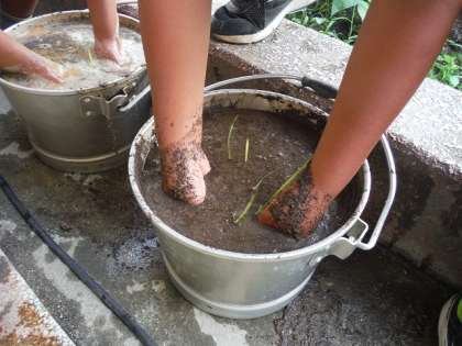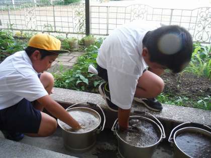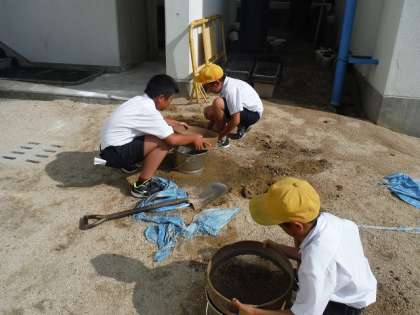 実際に自分たちも米作りの苦労や工夫を体験するために、バケツで稲を育てることにしました。教室で種もみを発芽させ(苗づくり)、運動場のはしっこの土を砕いてふるいで細かくしてバケツに入れ(田おこし)、そこに水を入れてよく混ぜて平らにならし(しろかき)、苗をバケツの田んぼに植えました。