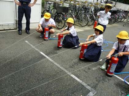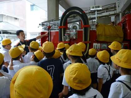 消防署のお仕事についてうかがう中で今まで自分たちが知らなかったことを知れて、子どもたちも驚きの表情を見せていました。例えば、あべのハルカスの屋上には火災現場を確認するためのカメラが設置されていることなどは、教科書にも載っていませんし大人の私も知らないことでした。また実際に消防車を見せて頂いたり、消火器を使って訓練をさせて頂いたりと貴重な体験もさせて頂きました。
