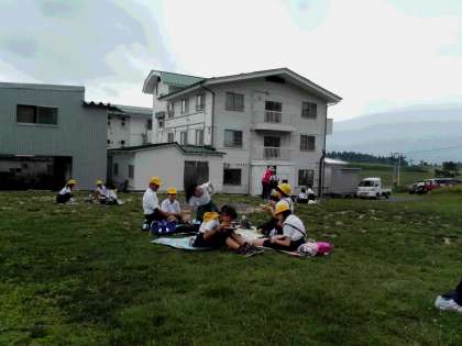 宿舎の左側の建物の2階は多目的ホール、その下が飯盒炊飯や焼板などの活動をするスペースです。宿舎の右手遥か遠くに見えるのが氷ノ山です。雲に隠れています。私たちの後方に鉢伏山があります。