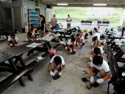 焼板の活動が始まりました。雷鳴の轟くなか黙々と板の墨を落としています。