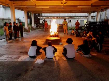 あいにくの雨模様ですが宿舎の方の工夫でミニキャンプファイアが始まりました。
