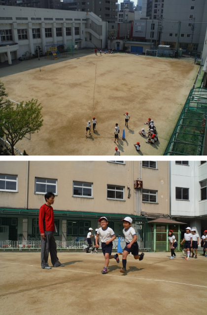 1時間目から体育。朝,集団登校でやってくる4年生の子に