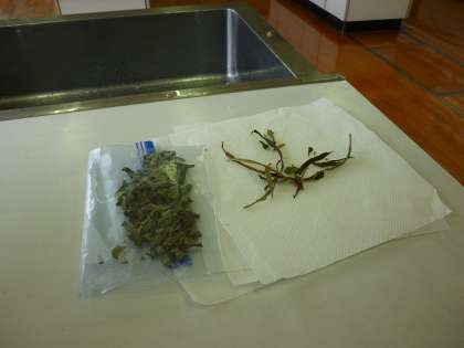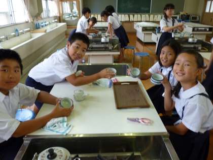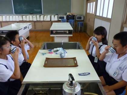 蒸してから2日間かげ干しした柿の葉の、太い葉脈を取り除き、細く切りました。きゅうすにひとつまみ入れて、熱湯をそそぎ、2分むらして、湯のみに注いで(家庭科でお茶の入れ方は習っていますので、もうお手のものです)……「おいしい!」「枝豆の香りがする!」「うーん、私はどくだみ茶のほうが好きかなあ…」いろいろな感想を聞くことができました。