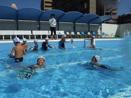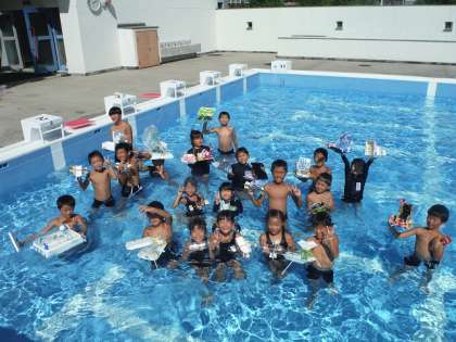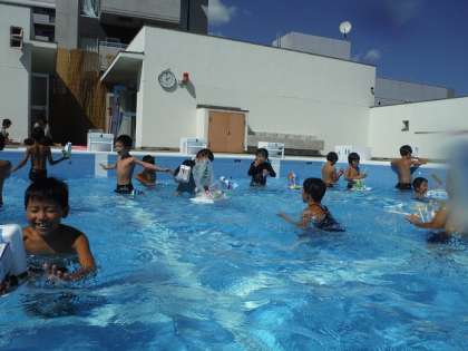 今日は1,2年生合同で水にうくおもちゃを浮かばせての活動をしました。プールの中に自分たちが作ったおもちゃを浮かべて、
