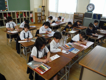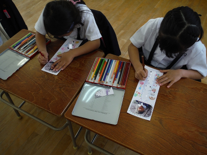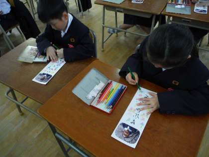 自分の顔写真と名前を書いた画用紙のまわりに,思い思いの絵を表現しました。すきな動物や果物など,色鉛筆でていねいに仕上げていました。
