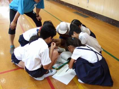 たてわり班で集まって,6年生の班長を中心に,ポイントの回り方や集団遊びの内容について話し合いました。