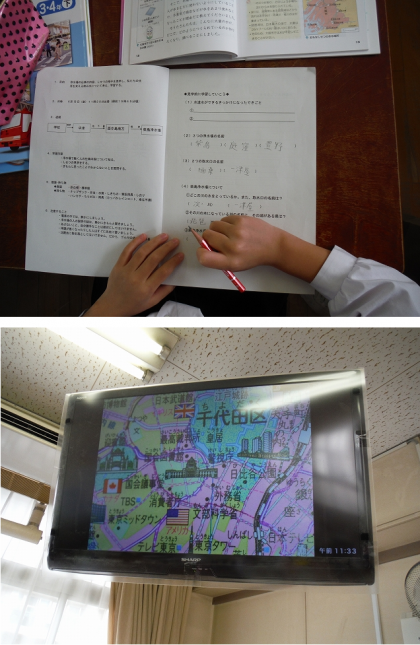 残り時間は5分,みんな興味津々の地図帳遊び。地名を探すゲームをしました。場所が分からない場合はグリッド(例えば,「2」の「あ」とか「3」の「え」など)で教えあっていました。先日習ったことがさっそく活きていましたね。えらいよ。