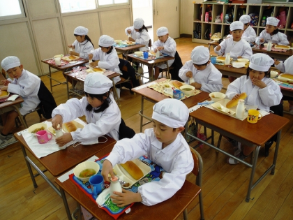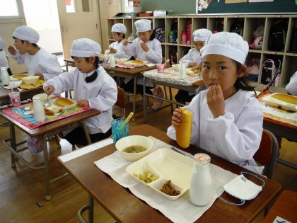 1年生の教室では,みんなおいしそうに給食をほおばっていました。