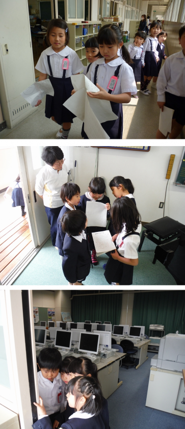 など,地図を見せながら2年生が1年生にやさしく話しかけて教えていました。