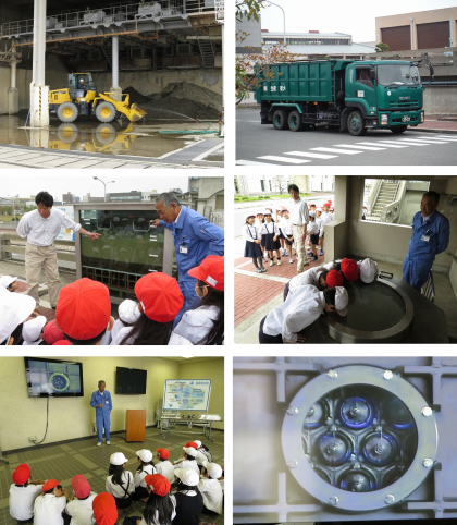 スラッジ「ケーキ」と言ってもおいしくないよと係の人のユーモアたっぷりの説明の場所がここでした。除去したごみや泥をトラックに載せて運び出します。お話の通り少しにおいがありました。ちょうど運ぶトラックがやってきました。
