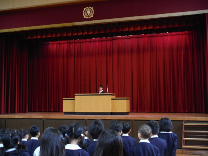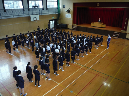 全校朝会では,教頭先生から「時間を守って行動しましょう。」という話と「時と場に応じて元気よくあいさつしましょう。」という話をしました。