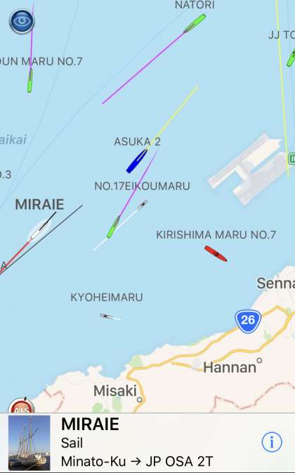 紀伊水道,友が島水道を経て,帆船『みらいへ』が大阪湾に入ってきました。