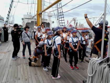 マスト登りの準備です。しっかり説明を聞きます。なぜか船上に保護者が。今年は出港前にマスト登りの体験なので「みらいへ」さんのはからいで出港までは船内見学と子どもたちの活動を参観させていただきました。