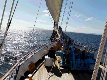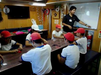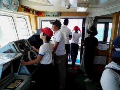 操舵体験、ロープワーク、バウスプリット渡りと班に分かれて活動しています。