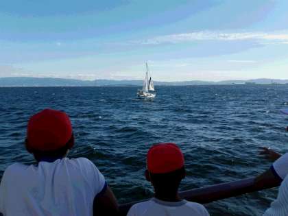 素敵なお客さん。航海中すぐ近くにヨットが接近してきました。なんと国際信号旗で「UW 」。私たちの安全な航海を、と送ってくれていました。