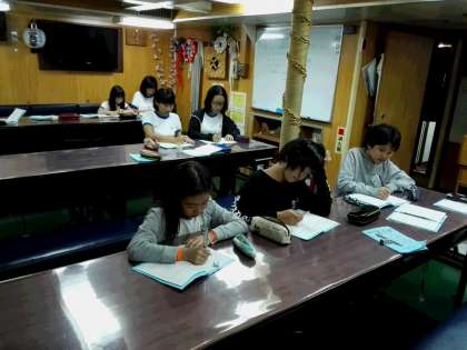 先にシャワーを済ませた女子は、メスルームで今日一日の振り返りをしています。