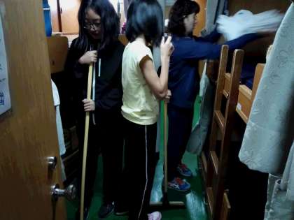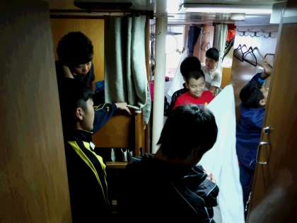 船内清掃。朝食後、使った寝具の片付け、部屋の清掃をしています。
