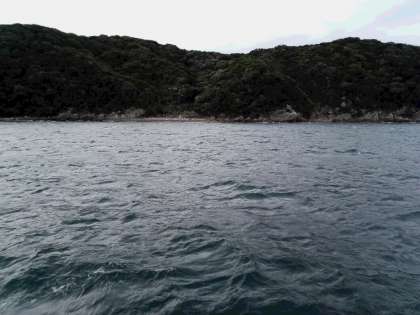 子どもたちが荷物の整理をしている間に「みらいへ」は、友ヶ島に来ています。まだ北風が強いので今日の活動は、風下になる南側に回って上陸します。写真は北側(大阪湾)です。白っぽく見えるのは漂着物です。