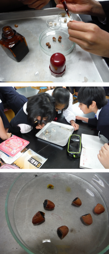 1日水にひたした種子やわらかくしたインゲンマメの種子をカッターナイフで切り,切り口にヨウ素液をかけて色の変化を調べました。