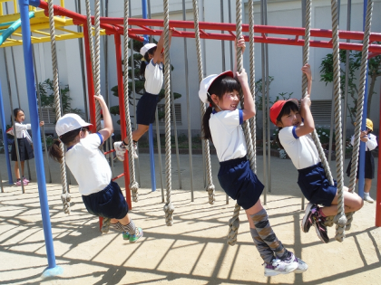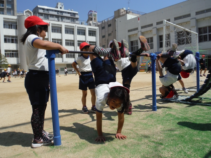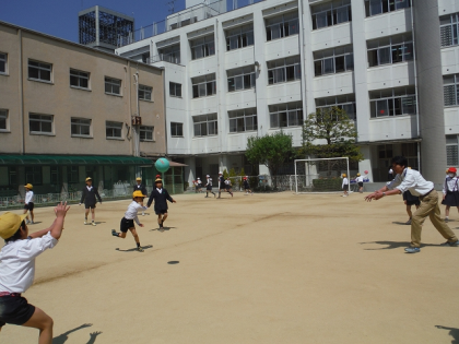 休み時間,子どもたちはドッジボールをしたり,鉄棒をしたり,おにごっこをしたり,のぼり綱で遊んだりと外で元気よく遊んでいました。
