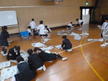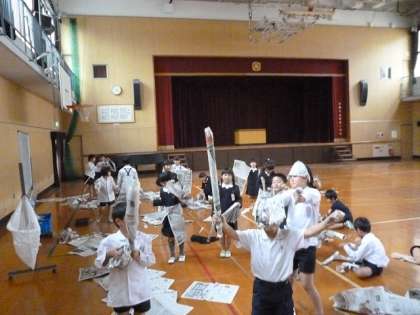 新聞紙を破いたりねじったり丸めたり一枚の新聞紙から枚数を増やし、想像を広げていろいろなものを作りました。かぶったり腰に巻いてみたり棒状にして剣やバットにしたり楽しく活動していました。