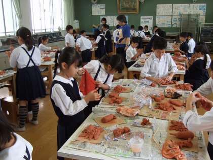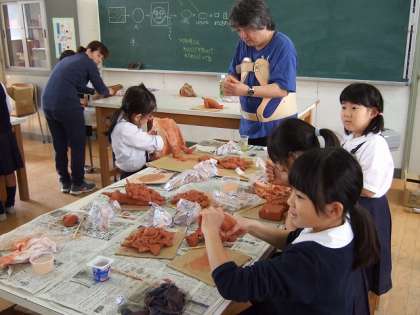 春の運動会で「エイサー」を踊り、パーランクーを打ち鳴らした3年生は、その時にシーサーにも出会い、秋の作品展には作ろうね!と言っていたので、とても楽しみにしてきました。1時間目、作り方を教えるために、担任が一気にシーサーを作りあげます。「うわあ!すごいー」という感嘆の言葉がきかれる中、できたものをその場で土塊に戻します。「ええっ?なんでー!?」。自由に、個性ある塑像を作ってもらうために、形などへの先入観を排除しました。さあ、子どもたちの真剣なまなざし。3時間、休むことなく、熱心に作り上げました。一人ひとりの個性の表れた、素敵な作品に仕上がりました。どことなく、作り手に似た面差し。是非作品展でその成果を見てあげてください。