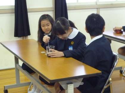 お茶の中に薬を入れると、なんと真っ黒に…。