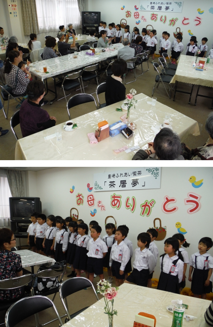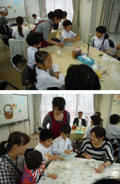 その後,前半と後半グループにに分かれ,地域の方々とともにティータイム。前半グループは飲み物とお菓子を後半グループの友だちに給仕しました。しばらくしたら交代です。地域の方とお話ししながら,楽しいひとときを過ごしました。子どもたちはみんな楽しそうにしていました。