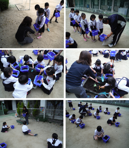 その後,担任の先生から種の植え方を教えてもらった後,穴をつくってアサガオの種を植えました。