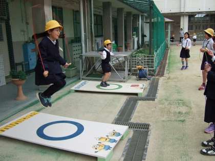チャレンジなわとび以外の休み時間にも,ジャンピングボードを使って2重跳びや2重あやとびをする子どもたちの姿が見られました。