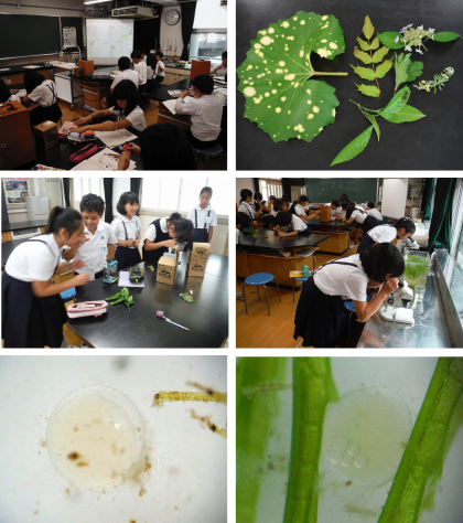 今日双眼実体顕微鏡を使って観察するのに適したものは何がよいか,事前に管理作業員さんに尋ねると,校内にある植物を教えていただきました。観察するのは,模様のような斑入りのツワブキの葉,アジサイの葉やつぼみと花,キクの葉,ヒイラギナンテンの葉,アッサムの花(小さな白い花),そしてミカンの葉にいたアゲハの幼虫です。