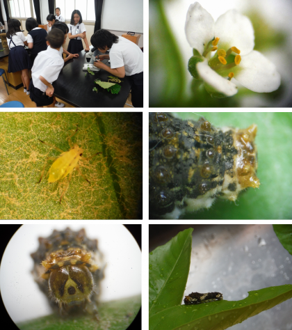 だんだんと理科室に活気がわいてきました。こちらが用意した植物ではなく,葉にいる昆虫を発見し,観察をし出しました!