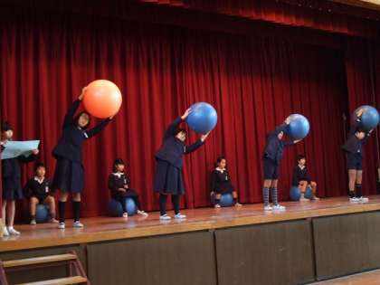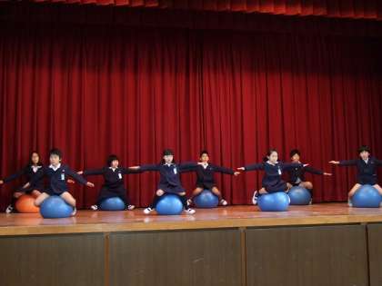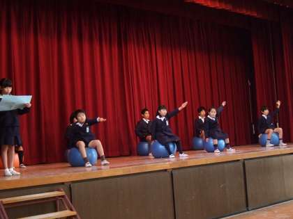 座る基本姿勢から練習し、11種類の体操を組み合わせ「365日の紙飛行機」の曲に合せて、バランスボール体操を発表しました。最後はボールにまたがり、上手にバランスを取りポーズをきめました。
