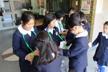 今日と15日の金曜日に児童会で赤い羽根募金を実施しています。