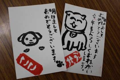 筆を使って文字を書いたり、来年の干支である戌を描いたり・・。